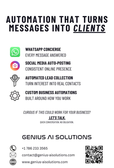 Genius AI Solutions designs practical AI automation products that eliminate this friction at the operational level. Our systems respond instantly, maintain consistent digital presence, and keep your business visible, accessible, and professional at all times without adding stress to your team.