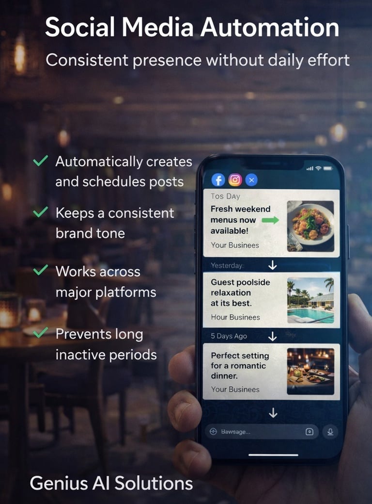Genius AI Solutions Social Media Automation keeps your brand active and professional across all major platforms without manual posting or constant oversight.