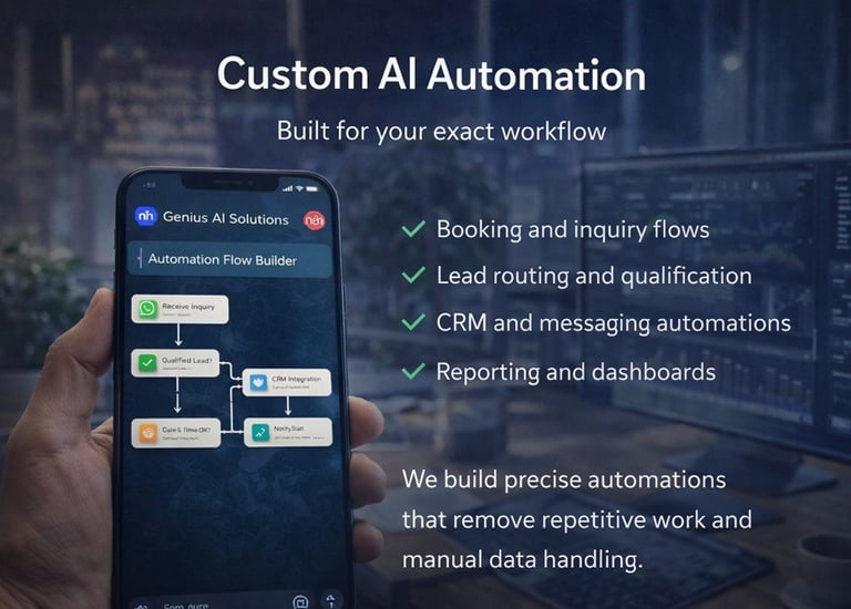 Genius AI Solutions designs custom AI automation using platforms like n8n, tailored precisely to how your business operates. We focus on removing repetitive work, manual data handling, and operational friction.